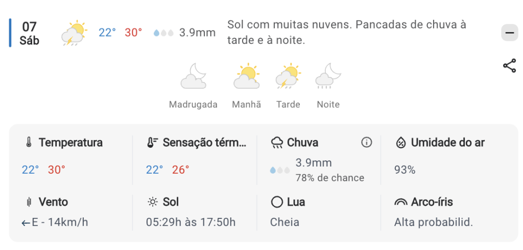 Para esse sábado (7), a expectativa do portal Clima Tempo é registrar pancadas de chuva à tarde e noite. A temperatura mínima é de 22 graus e máxima de 30 graus. A umidade média do ar deve ficar em 93%.