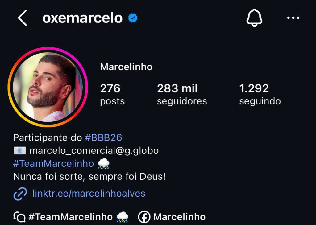 Quando deixou a casa, Marcelinho estava com pouco mais de 200 mil seguidores no Instagram, na manhã de hoje, o perfil estava com 283 mil.