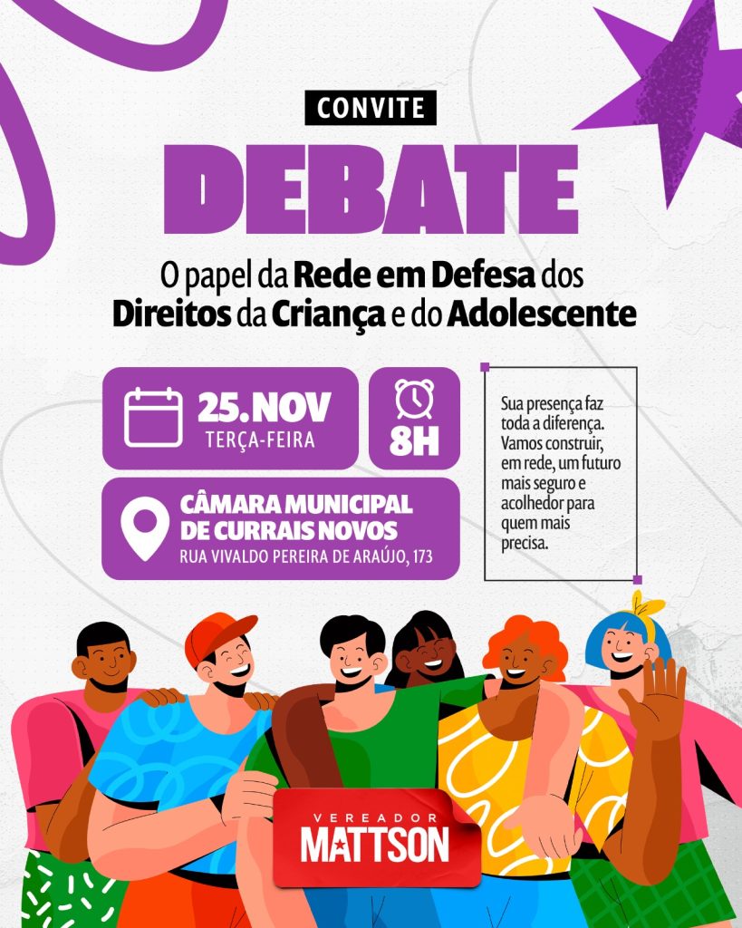 A Câmara Municipal de Currais Novos, por iniciativa do mandato do vereador Mattson Ranier, realizará nesta terça-feira, dia 25, às 8h, um encontro amplo para discutir as ações de defesa dos direitos da criança e do adolescente no município.