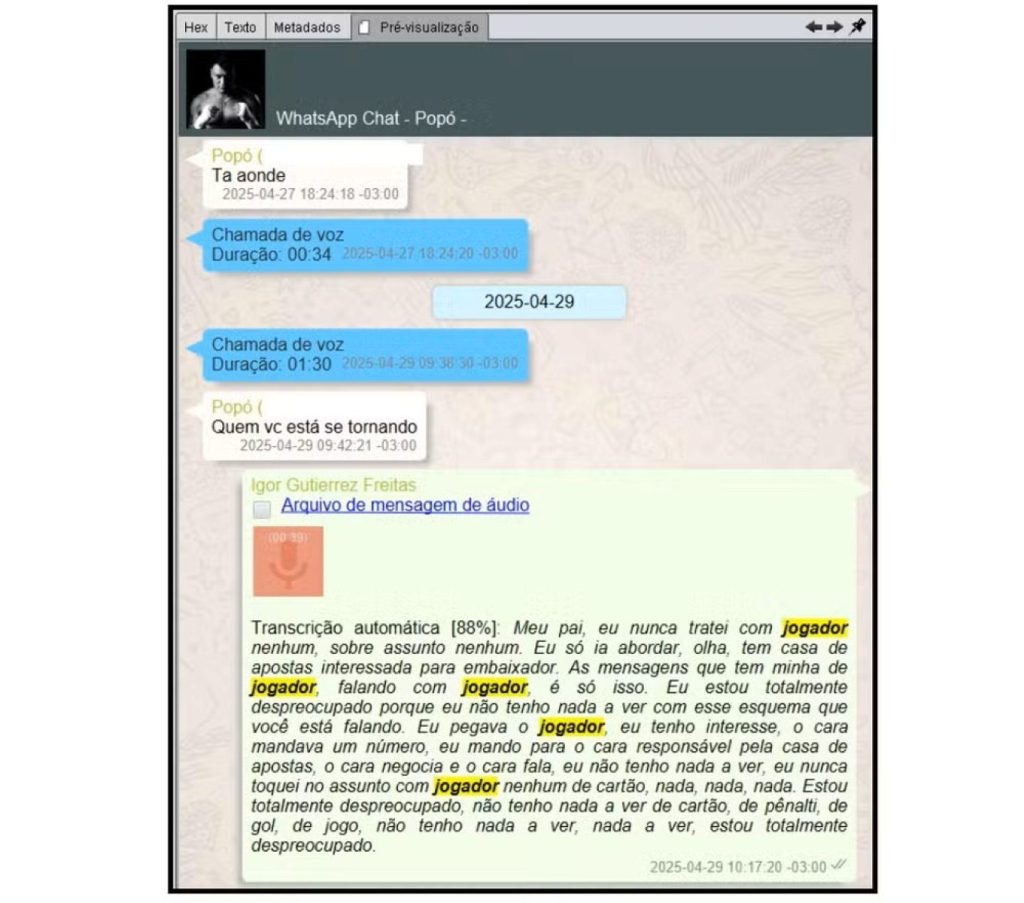 A denúncia inclui mensagens trocadas entre Popó e Igor em 29 de abril de 2025, antes da operação, nas quais Popó questiona quem o filho estava se tornando, em meio a áudios defensivos de Igor relacionados ao aliciamento. Em outra conversa de 18 de maio de 2025, Popó alerta para a “forçação de cartão” e Igor nega envolvimento, mantendo tom defensivo.