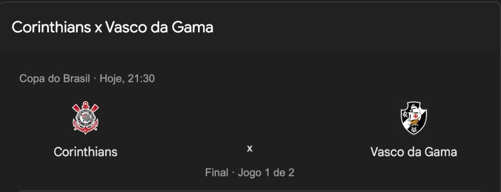Nesta quarta-feira, a partir das 21h30 (horário de Brasília), Corinthians e Vasco disputam o primeiro jogo da final da Copa do Brasil, na Neo Química Arena, em São Paulo. O confronto terá transmissão ao vivo de Globo, prime video, sportv, Premiere e ge tv.