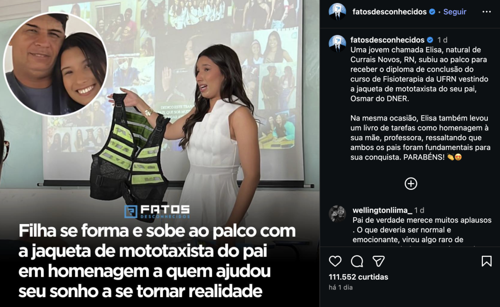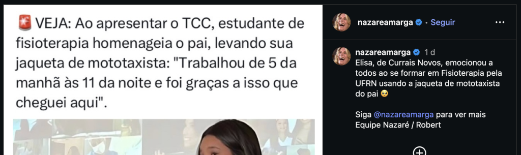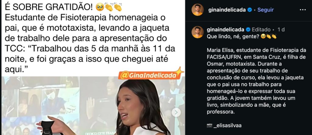 “Tem histórias que renovam a nossa esperança no Brasil, no jovem e no futuro. Esse gesto representa milhões de famílias brasileiras. Pais e mães que acordam cedo, enfrentam sol, chuva, trânsito e cansaço. Tudo para garantir que os filhos tenham oportunidades que eles não tiveram. Gente que acredita, como eu acredito, que educação é o motor da transformação. E quando um filho reconhece isso é a certeza de que nenhum sacrifício foi em vão. Mostram que o mérito não é só individual. É familiar. Parabéns a essa filha. Parabéns aos pais!!”, disse o apresentador