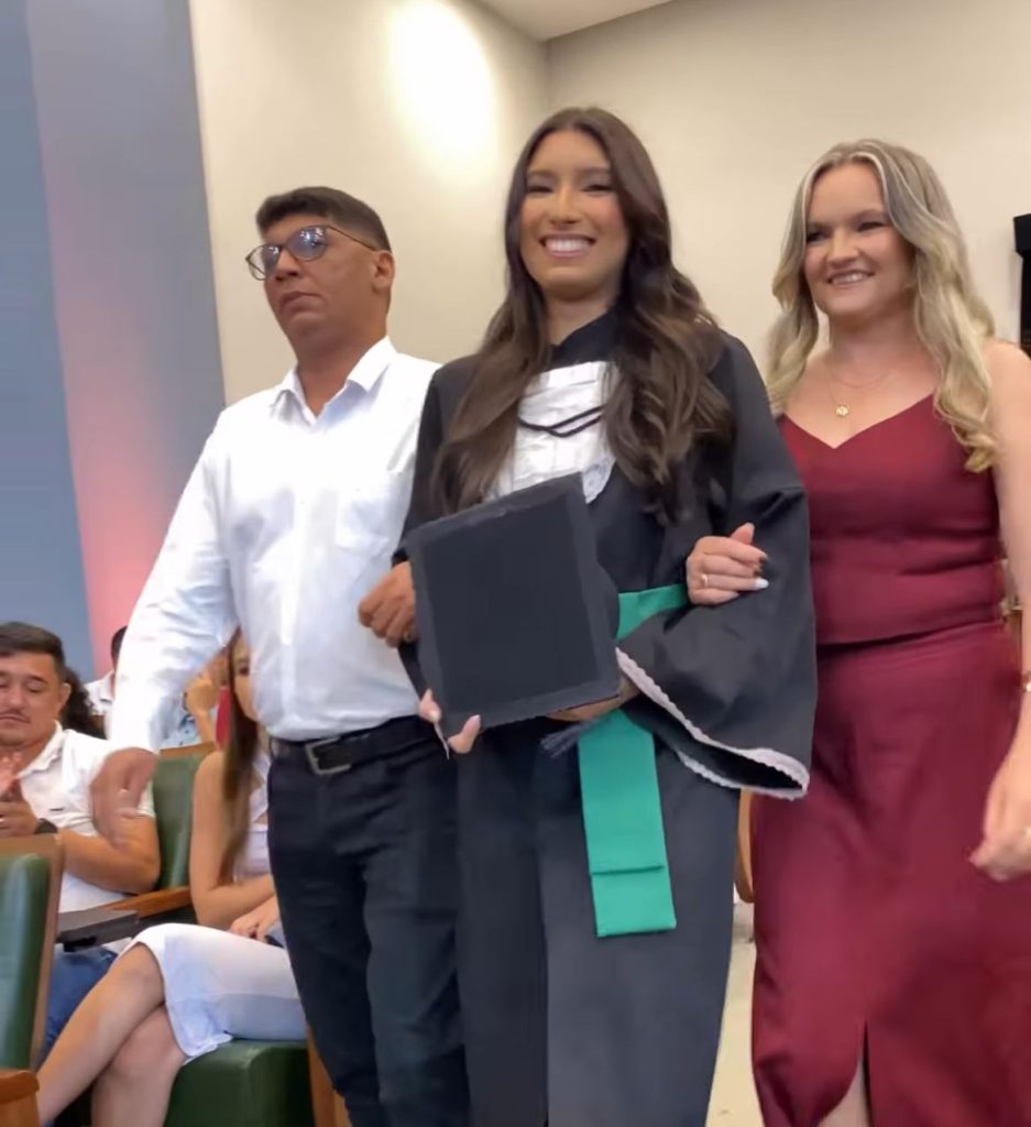 Na sua entrada, ao seu lado estavam seu pai e sua mãe, vivendo o orgulho da conclusão de mais uma etapa vencida pela sua filha. Parabéns à jovem e parabéns aos pais pela conquista.