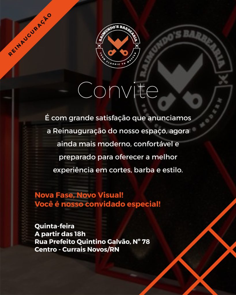 Currais Novos ganhará nesta quinta-feira (16) um novo espaço de referência em estilo e cuidado masculino. É dia de inauguração da sede reformada da Raimundo’s Barbearia, celebrando a reinauguração de seu ambiente, agora totalmente renovado, mais moderno, confortável e pensado para proporcionar uma experiência completa em cortes, barba e estilo.