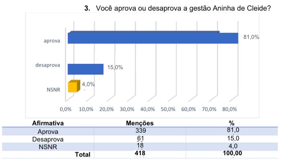 De acordo com os dados, 81% dos entrevistados aprovam a gestão da prefeita Aninha. Ao todo, 339 pessoas afirmaram aprovar a gestão, enquanto 61 entrevistados (15%) disseram desaprovar. Outros 18 participantes (4%) informaram não saber ou preferiram não responder.