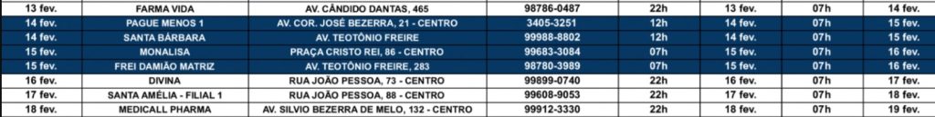 A tabela abaixo contém a data, nome da farmácia de plantão, endereço, telefone e horário exato do plantão em questão.