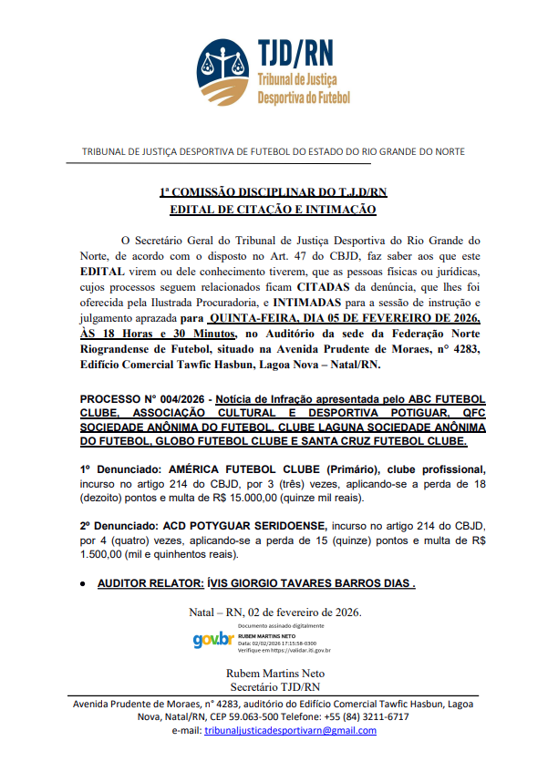No caso do América, a denúncia aponta três infrações ao artigo 214, o que pode resultar na perda de 18 pontos, além de multa no valor de R$ 15 mil. Já o Potyguar Seridoense é acusado de quatro infrações, com possibilidade de perda de 15 pontos e multa de R$ 1.500.