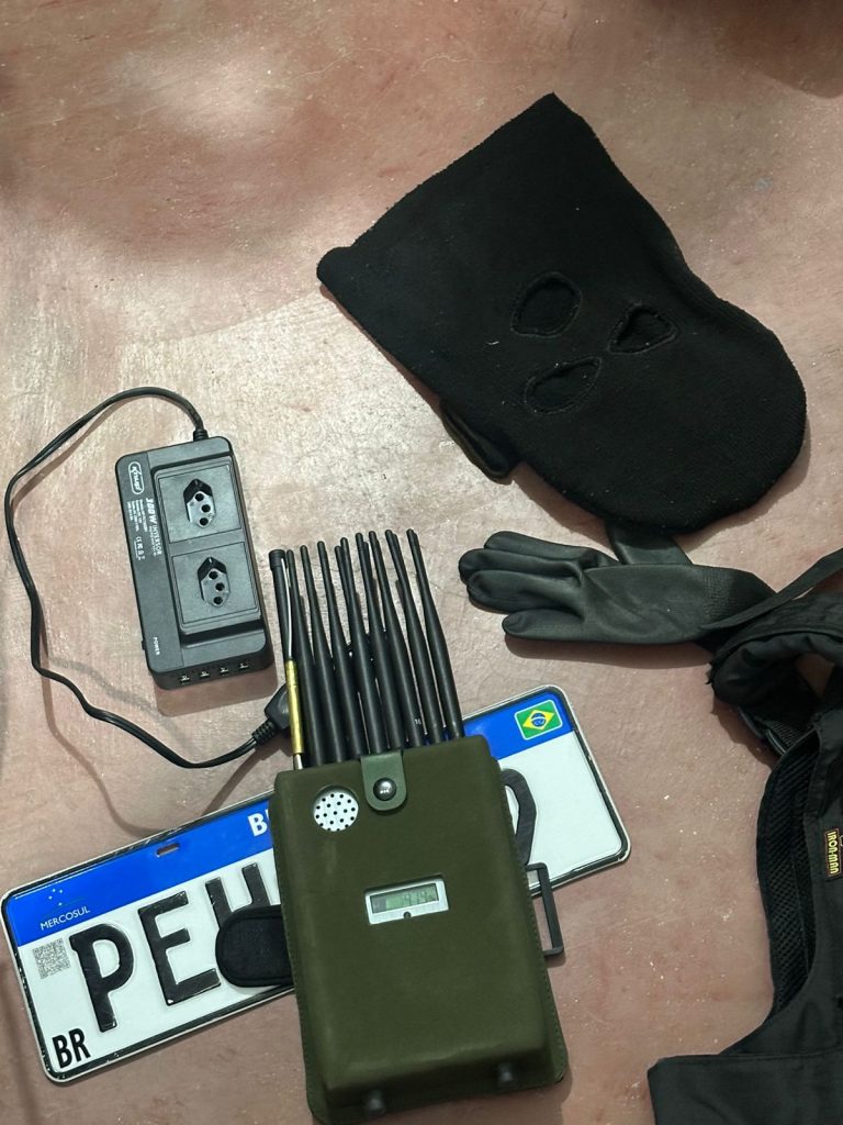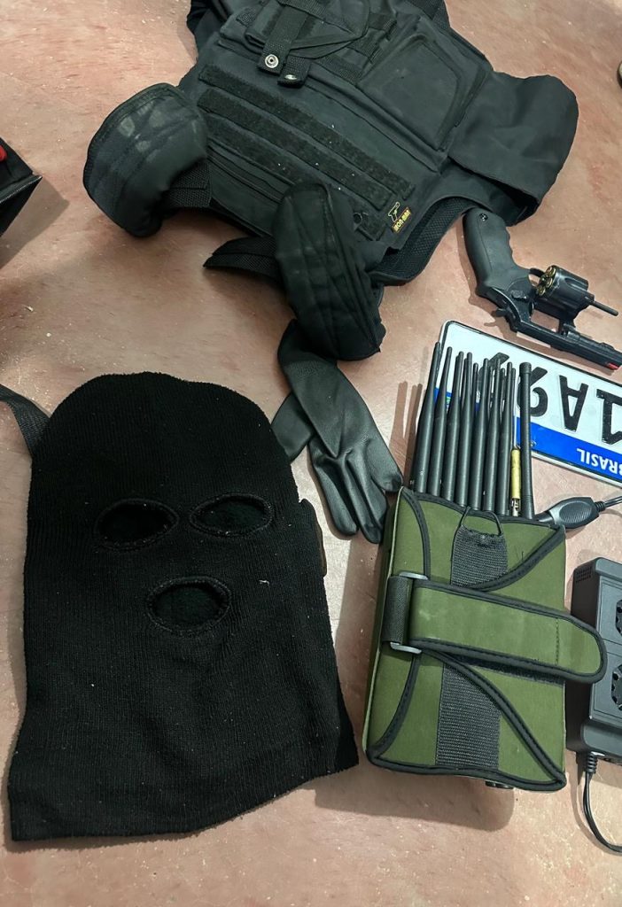 Foram apreendidos uma pistola, um bloqueador de sinal, uma balaclava e um colete balístico com placa de cerâmica.